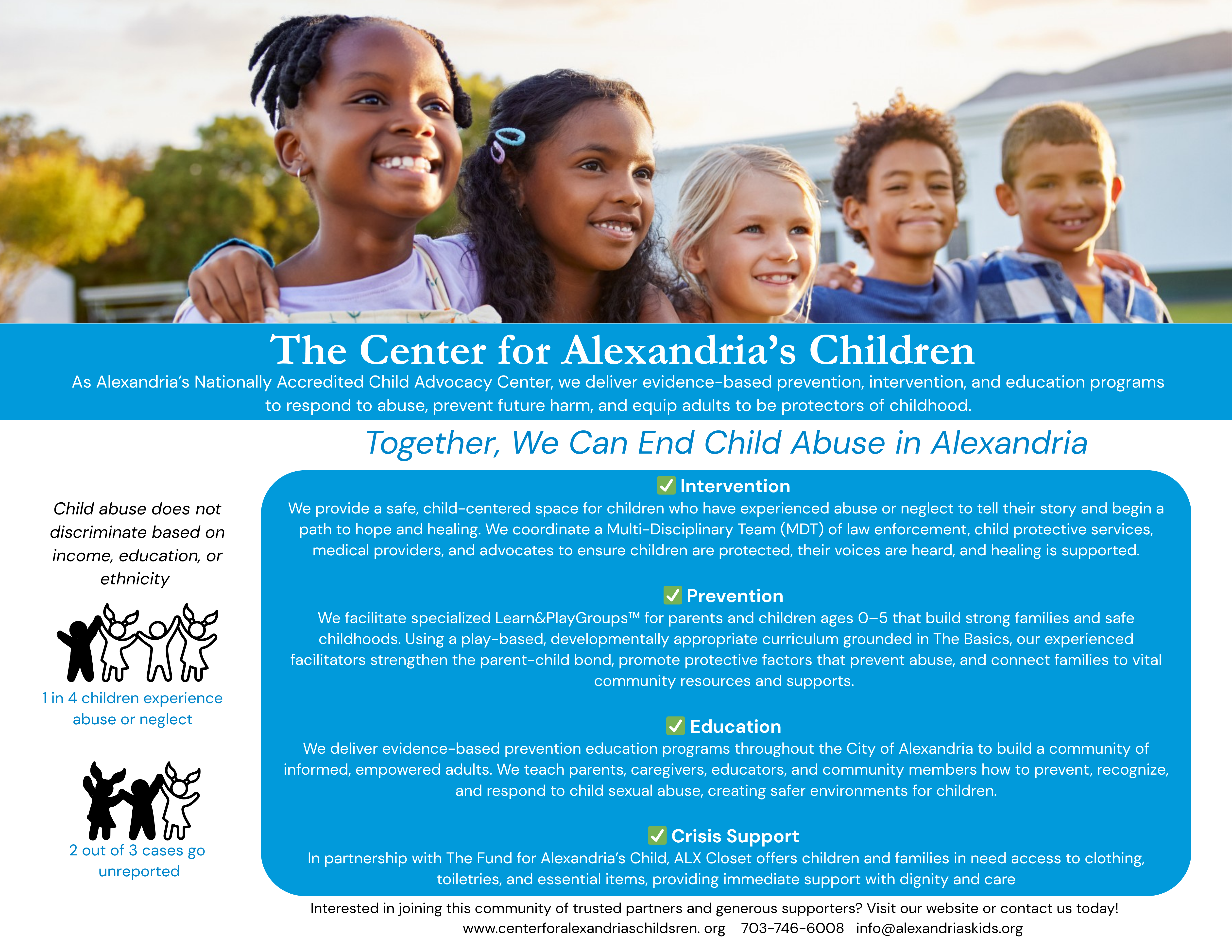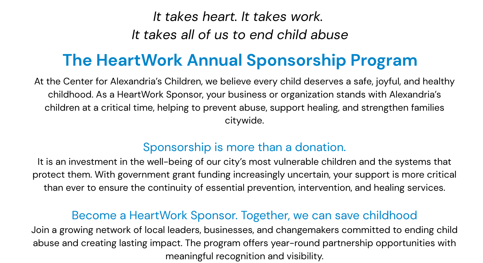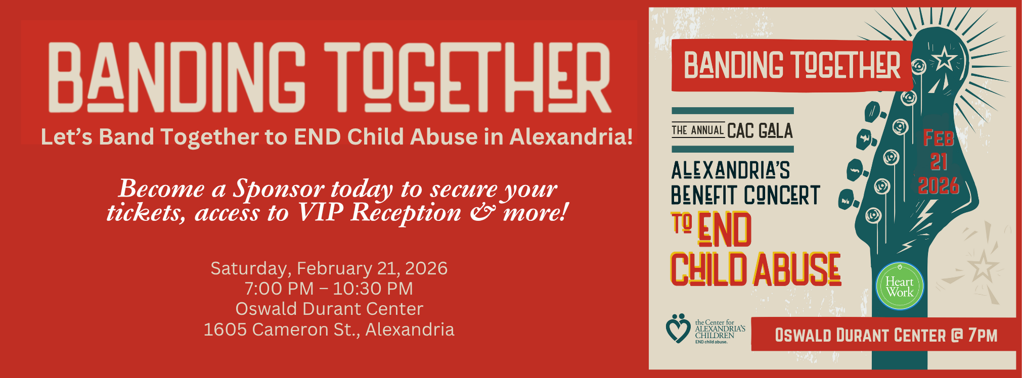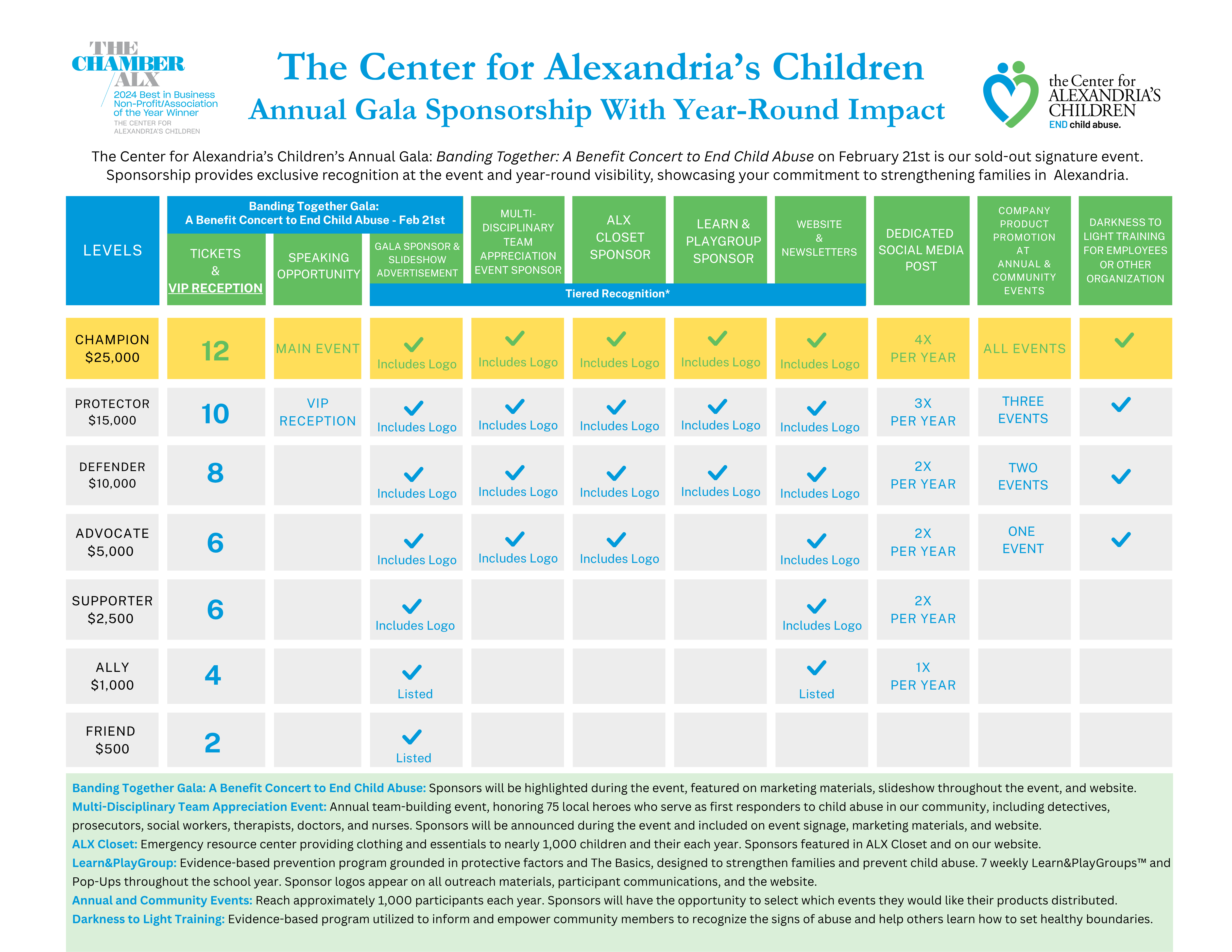 All sponsorships include tickets and access to the VIP reception for Banding Together: Alexandria's Benefit Concert to End Child Abuse on February 21, 2026.